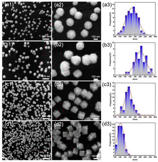 Figure 1 shows SEM images and the corresponding particle size distribution histograms for the PtIr nanoparticles with various morphologies prepared using PSPW. It can be seen that all the obtained PtIr nanoparticles exhibit good dispersibility and that the nanoparticle sizes are relatively uniform. It is worth noting that the lower potential limit of EL has a significant effect on the morphology of PtIr nanoparticles. When the EL is –0.4 V(SCE), the PtIr nanoparticles exhibit a smooth, spherical morphology (Figure 1(a1,a2)) and their average particle size is approximately 170 nm (Figure 1(a3)). When the EL decreases to –0.5 V(vs. SCE), the PtIr nanoparticles present a spherical morphology with a relatively rough surface (Figure 1(b1,b2)) and an average particle size of about 205 nm (Figure 1(b3)). As the EL further reduces to –0.6 V(SCE), the PtIr nanoparticles show a spiky cubic shape (Figure 1(c1,c2)) and a small average particle size of around 155 nm (Figure 1(c3)). When the lower limit potential EL is as low as –0.7 V(SCE), the obtained PtIr nanoparticles exhibit a cubic shape (Figure 1(d1,d2)). A smaller average size of about 122 nm for the PtIr nanocubes was observed (Figure 1(d3)). Obviously, with the decrease in the lower potential limit, the morphology of the PtIr nanoparticles evolves from smooth nanospheres to nanospheres with a rough surface, spiky nanocubes, and nanocubes. This suggests that the morphology of PtIr nanoparticles strongly depends on the lower potential limit of EL.