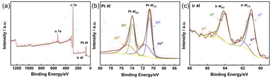 The chemical states of Pt and Ir in the PtIr nanocubes were determined using XPS. Figure 5a shows the XPS full spectrum of the PtIr nanocubes. The two peaks appearing at 70.6 and 74.0 eV correspond to Pt 4f7/2 and Pt 4f5/2, respectively (Figure 5b). The Pt 4f spectra can be deconvoluted into two sets of doublet peaks. The deconvoluted peaks at 70.6 and 74.0 eV correspond to Pt0, while the other peaks at 71.6 and 74.9 eV were all attributed to Pt2+. Regarding the Ir XPS spectrum, distinct peaks at 61.1 and 64.2 eV for Ir 4f7/2 and Ir 4f5/2 were observed, respectively (Figure 5c). Two sets of deconvoluted doublet peaks in the Ir 4f spectra correspond to the metallic Ir0 (at 61.1 eV for Ir 4f7/2 and at 64.2 eV for Ir 4f5/2) and Ir3+ (at 62.2 eV for Ir 4f7/2 and at 65.5 eV for Ir 4f5/2). Notably, compared with pure Pt (71.2 and 74.5 eV) and pure Ir (60.9 and 63.9 eV) [], the binding energies of Pt 4f7/2 and Pt 4f5/2 display a slight negative shift, while a slight positive shift was observed for Ir 4f7/2 and Ir 4f5/2. The changes in binding energy can be ascribed to the strong electronic interaction between Pt and Ir [], further suggesting the formation of a PtIr alloy.