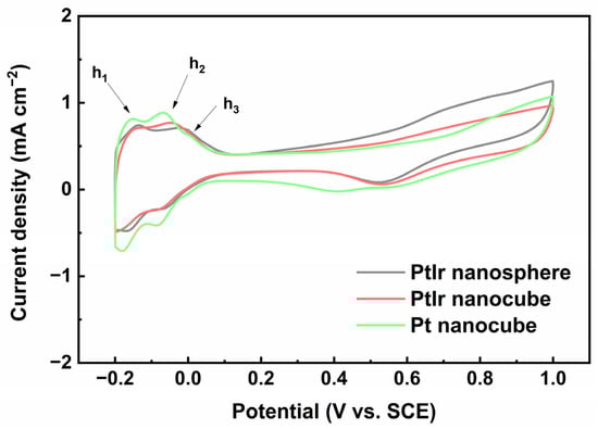 To investigate the electrochemical behavior of the obtained PtIr nanocubes, CV tests of the electrodes were conducted. Figure 6 shows the CV profiles of the obtained nanoparticles recorded in an N2-saturated 0.5 M H2SO4 solution. The obtained pure Pt nanocubes (Figure S1, Support Information) were used for comparative purposes. All the CV curves display typical potential regions: hydrogen adsorption/desorption (–0.20 V~0.08 V (vs. SCE)), an electric double layer (0.08 V~0.31 V (vs. SCE)), and the formation/reduction of Pt/Ir oxide (0.31 V~1.00 V (vs. SCE)). Notably, three main anodic peaks of h1, h2, and h3 are observed at about –0.15, –0.06, and 0.02 V (vs. SCE) for the Pt nanocubes and PtIr nanocubes in the forward scan, corresponding to the hydrogen desorption of (110) sites, (100) step sites, and (100) terrace sites, respectively []. By contrast, only h1 and h2 anodic peaks appear for the PtIr nanospheres. The anodic peak of h1 results from the desorption of weakly bonded hydrogen species, while the anodic peaks of h2 and h3 originate from strongly bonded hydrogen species []. Regarding the Pt nanocubes, the anodic peak of h2 is distinctly higher than that of h1, which is a typical feature of Pt with preferential (100) facets []. Moreover, the appearance of the h3 peak further proves its preferential Pt (100) crystal orientation. The PtIr nanocubes also display a significantly higher h2 peak than h1 as well as an h3 peak corresponding to (100) terrace sites, which is similar to Pt nanocubes. This indicates once again that the obtained PtIr nanocubes possess a preferential (100) crystal orientation. This is consistent with the HRTEM results (Figure 2c). Moreover, the CV profile of the PtIr nanospheres is similar to that of polycrystalline PtIr nanoparticles reported in the literature [], indicating the typical polycrystalline feature of PtIr nanospheres. Since hydrogen desorption is very structure-sensitive to Pt, the CV profiles can be used to qualitatively estimate the number of active sites on the Pt surface. The electrochemically active surface area (ECSA) is estimated from the charge of the hydrogen desorption peak in the forward CV scan, assuming a charge density of 210 C cm−2 for one monolayer of hydrogen desorption on Pt [].