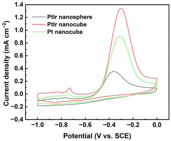 CVs of PtIr nanosphere, PtIr nanocube, and Pt nanocube nanoparticles tested in 1 M KOH + 0.05 M (NH4)2SO4 aqueous solution at 10 mV s−1.