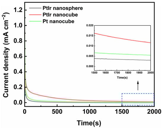To assess the stability of the obtained PtIr nanocubes towards the AOR, a chronoamperometric test (CA) was performed at −0.36 V (vs. SCE) for 2000 s. Figure 8 shows a typical set of CA curves for these catalysts. The current densities of the obtained PtIr nanospheres, PtIr nanocubes, and Pt nanocubes all drop sharply at the initial stage, which is related to electric double-layer charging []. Afterwards, the current density decays slowly to a steady-state, which is associated with the consumption of the electroactive species near the electrode surface [] and the toxification of N adatoms on the surface of the catalysts []. At 2000 s, the steady-state current densityvalues of the PtIr nanocubes are about 0.012 mA cm−2, which are 4 and 2.3 times higher than those of the PtIr nanospheres (0.003 mA cm−2) and Pt nanocubes (0.005 mA cm−2), respectively. This indicates that the obtained PtIr nanocube catalyst possesses high stability towards AOR in an alkaline medium. The (100) sites of the PtIr nanocubes can stabilize the adsorbed active intermediate of NH2, favoring the formation of the final product, N2 [,], and thus alleviating the deactivation of the Pt catalyst. On the one hand, introducing Ir into Pt will enhance the capacity of the NHx intermediates to recombine and thus be further oxidized into N2. Hence, the high stability towards the AOR for the PtIr nanocube catalyst can be ascribed to the synergy of (100) sites and the introduced Ir for the PtIr nanocubes [].