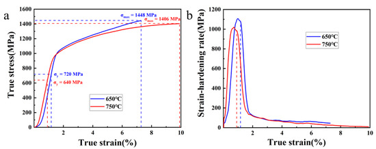 (a) Compression true stress-true strain curve of FGH96 at 650 °C and 750 °C. (b) Strain-hardening rate curve of FGH96 at 650 °C and 750 °C.