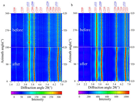 Unrolled two-dimensional diffraction rings of the sample before and after compression at (a) 650 °C and (b) 750 °C.