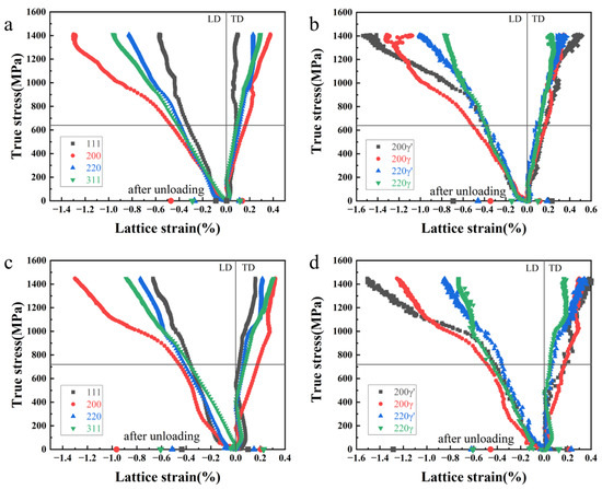 Evolution of true stress-lattice strain curves: (a) lattice planes of mixed γ/γ′ phases at 750 °C; (b) (200) and (220) planes of γ and γ′ phases at 750 °C; (c) lattice planes of mixed γ/γ′ phases at 650 °C; and (d) (200) and (220) planes of γ and γ′ phases at 650 °C.