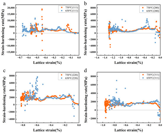 Figure 4 was obtained by deriving the true stress-lattice strain curve, corresponding to the work hardening rates of (111), (200), (220) and (311) lattice plane at 750 °C and 650 °C, respectively. The evolution pattern of lattice strain was almost identical at 750 °C and 650 °C. The main difference was that the lattice strain gradient at 650 °C was more negative. That is, the blue dot in Figure 4 was more distant from zero, which means that the pile-up rate of dislocation at the γ′ interface at 650 °C was greater than that at 750 °C, consistent with the macro stress–strain curve shown in Figure 1. The discontinuous change in the curve indicated that dynamic recovery was initiated simultaneously in the microstructure. However, the overall trend of the curve indicated that work hardening was still dominant.
