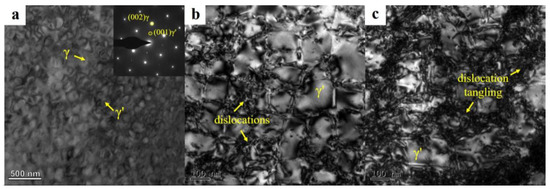 The microstructures of the original and compressed samples were observed using TEM, and the results are shown in Figure 5. As can be seen from Figure 5a, it is reasonable that almost no dislocations existed in the sample before compression, because the sample was annealed for 16 h, which made the γ′ phase reach a relatively stable morphology. After the compression at 650 °C, the dislocations multiplicated substantially, which were mainly tangled around the γ′ particles and severely blocked (Figure 5b), indicating that the γ′ phase was subjected to strong stress concentrations. Due to the ordered structure of γ′ phase, the critical shear stress of the dislocation activation was high, which made it difficult for the dislocations to slip into the interior of the γ′ phase, resulting in dislocation pile-up at the interface of γ/γ′. After slipping for a certain distance in the γ phase, the dislocations were quickly blocked by the densely distributed γ′ phase, and thus the sample showed a strong work hardening effect. During compression at 750 °C (Figure 5c), it can be seen that the density of the dislocation was still high. As the true strain value of the two samples were not identical (limited by the maximum pressure and strength of the indenter), it was difficult to compare the density of dislocation in parallel for the two samples after compression. However, the common feature was that the dislocations were obviously blocked by the γ/γ′ interface. Due to the relatively small amount of plastic deformation of the γ′ phase at 750 °C, only a few dislocations could slip into the γ′ phase. This also indicated that the stress concentration was lower than that at 650 °C, which corresponded to the low residual lattice strain in Figure 3.