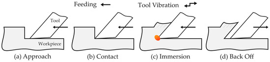 Vibration can be applied either to the cutting tool, namely, the Actuated Tool System (ATS), or to the workpiece, namely, the Actuated Work System (AWS), corresponding to one of the main system-defining characteristics [14,27,30]. Vibrating tool systems, the most common alternative, are often studied based on the motion of the cutting tooltip. The discontinuity between the two surfaces consists of four basic movements (Figure 1) repeating cyclically with the applied frequency: approach, contact, immersion, and back off.