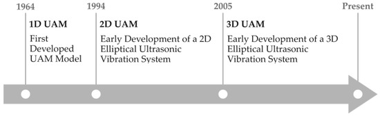 Historical timeline of the initial developments in distinct UAM vibration types, P. Legge (1964) [33], E. Shamoto (1994) [34], and E. Shamoto (2005) [35].
