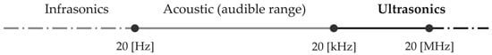The ultrasonic designation comes from the implied vibration frequency values in the audio frequency spectrum. An ultrasonic transducer converts the electrical energy into mechanical vibrations that are transmitted to the component. The vibration frequency belongs in the ultrasonic range, beyond the upper limit of human hearing, generally over 20 kHz [28,32]. The audio frequency spectrum is depicted in Figure 3, in which the ultrasonic domain can be observed next to the acoustic range.