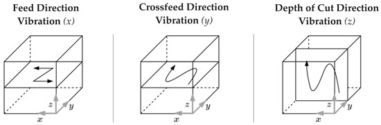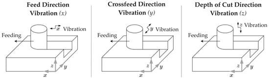 Since vibration can be applied to three directions in a milling operation, Figure 4 includes a schematic representation of the three cases. These refer to vibration in the primary cutting (feed), crossfeed, and depth of cut directions, represented by the x, y, and z axes, respectively.