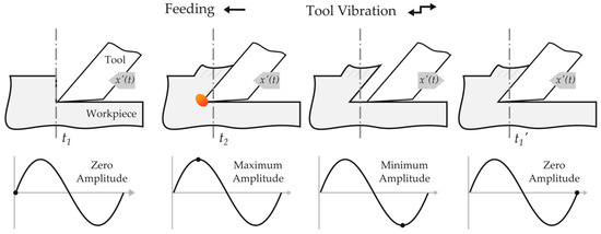 When vibration coincides with the feed direction, only the x axis is studied. Considering the four stages depicted in Figure 1, the tool’s position can be studied according to the vibration amplitude. Such a scenario is presented in Figure 5.