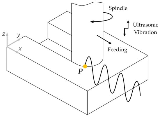 Considering the abovementioned analysis, Figure 7 depicts the critical case of an axial vibrating (z-direction) ATS milling system. A schematic representation of the system is given by adding a randomly selected point, P, within the tool’s cutting edge.