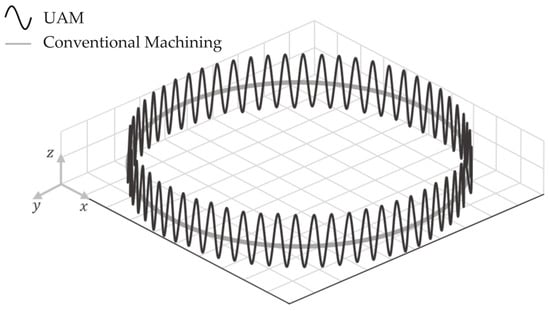 The spatial trajectory of the selected point within a single tool rotation with vibration should also be considered for comparison with an equivalent point without the applied harmonic wave. Figure 8 represents this scenario.