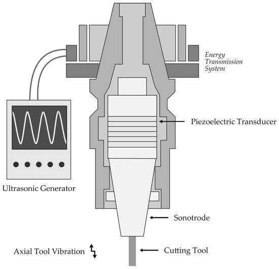 Applying ultrasonic vibration to conventional machining processes started with turning operations and can be traced almost as far back as the first ultrasonic machining technologies. The consequent employment of other traditional machining techniques has increased with the exponential growth of the machining industry, paced by the evolution of ultrasonic transducers and horn structures. UAM systems are the evolution of conventional USM techniques [6,12,14,28], where high-frequency vibration is applied to one or more components of a machining operation instead of relying on an abrasive mixture for material removal. A traditional tool with cutting edges is used, while applied vibration causes discontinuity in the tool–workpiece interaction, increasing the efficiency of the process in question [7,11,27].