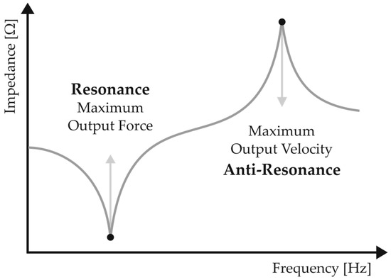 An electromechanical analogy relating electrical current to force and voltage to velocity can be established. Given the nature of the corresponding circuit, it can be understood that the transducer can deliver maximum output force (or pressure) and relatively low velocity at resonance. This regime would be the theoretically most effective frequency at which the transducer could operate, resulting in maximum vibration amplitude. At the system’s anti-resonant regime, maximum output velocity and minimum output force will be delivered (minimum vibration amplitude) as the transducer’s mechanical and electrical components are not in phase.