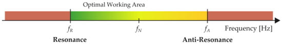 While in theory, a system would perform best at the analyzed resonant frequency, a small frequency deviation can cause the transducer to operate in its capacitive zone, leading to system failure. Hence, the optimal working frequency area for the transducer is shown in Figure 11, regarding a color-coded system, with red indicating the least favorable, and green indicating the most favorable scenarios.