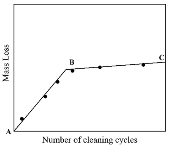 After the testing, the samples surfaces were cleaned of the corrosion products according to ASTM G1-03 [26] by repeating multiple steps of immersion in nitric acid (HNO₃) at a concentration of 69%, followed by immersion in an organic solution and ultrasonic cleaning. The standard suggests repeating multiple cleaning cycles to have better control over the weight loss. The mass loss should be plotted against the number of cleaning steps performed, until a curve is obtained as in Figure 1. The flat segment corresponds to the beginning of the removal of the bulk material during the cleaning process, which means that all the corrosion products have been eliminated. The mass loss value to be used in Equation (1) is represented by point B.