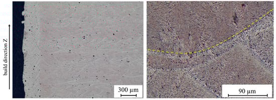 Microstructure of AlSi10Mg_SR_NM specimens in a section parallel to the printing direction. The yellow dashed line highlights one of the melt pool boundaries.