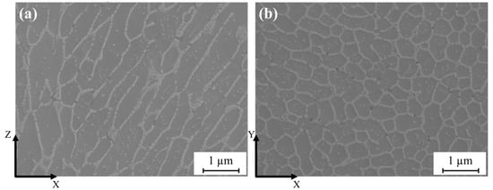 The SEM observation of the AlSi10Mg_SR_NM processed by L-PBF (Figure 3) is consistent with the literature. The extremely fast cooling rates in the range of 103–108 K/s [30] caused a cellular-dendritic solidification mechanism. Two distinct phases were obtained: a cellular-dendritic α-Al phase, rich in aluminium with dispersed Si (the grey islands in Figure 3), and a eutectic Al-Si phase, rich in Si and poor in Al [20], represented by the lighter grid. Observation of the sections along the Z-build direction (Figure 3a) and parallel to the layers (Figure 3b) reveals that the grains are elongated along the Z axis.