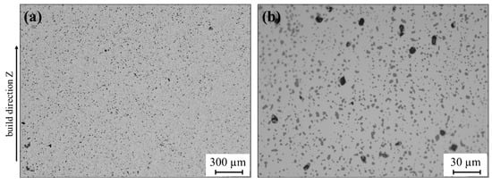 Microstructure of AlSi10Mg_T6_NM additive manufactured sample. (a) lower, and (b) higher magnification. The melt pools are not distinguishable, and the Si domains are uniformly distributed in the Al matrix. The small black spots are residual pores.