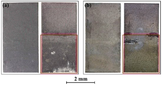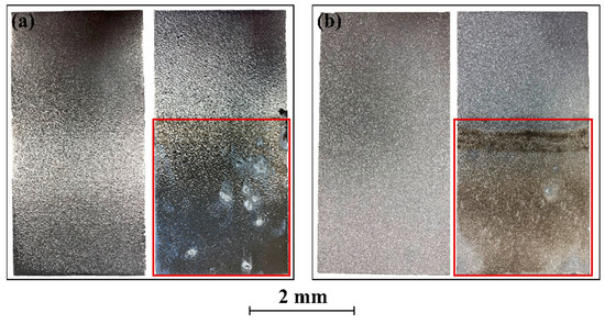 Visual comparison of (a) AlSi10Mg_SR_DLT and (b) AlSi10Mg_SR_SB before and after partial immersion in NaCl (5%).