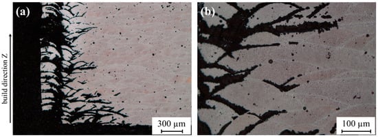 Figure 2 shows the microstructure along the Z direction of the AlSi10Mg_SR_NM samples. Melt pools representative of the layer-by-layer laser scanning strategy can be seen, including their contour and core areas. The distinguished layers confirm the material’s anisotropy, as it is known that the application of a stress-relief anneal leaves the melt traces unchanged [27]. The small dark spots are residual pores.