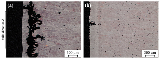 Analyses of the metallographic sections of the two surface-finished specimens (Figure 13) displayed the mechanism of corrosion propagation already described in Figure 8 for the specimens from SR. Even in this case, the corrosion proceeded along the melt pool boundaries. However, the DLT specimen exhibited deeper corrosion that extended beyond the thickness of the sample that was built during L-PBF using the contour strategy and reached the sample core. On the contrary, for the SB sample, the corrosion stopped within the contour region without progressing further. This could be due to the closure of defects as a result of plastic deformation during the sand blasting, reducing the number of sites where corrosion could begin. The protective effect of sand blasting could also be due to the compressive stress state due to the slight work hardening at the surface of the specimen.