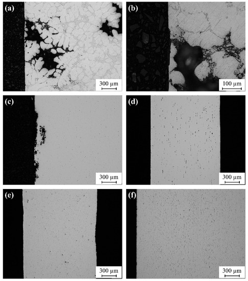 Metallographic sections of (a,b) A356_T6_NM, (c) 6082_T6_NM, (d) 5083_O_NM, (e) 1050_H24_NM and (f) 3003_H111_NM specimens after immersion in NaCl (5%) for 30 days.