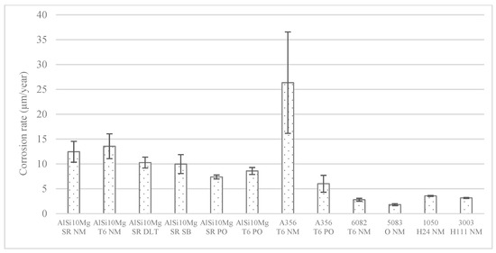 In addition to visual inspection, the corrosion behaviour was determined numerically by calculating the corrosion rate for specimens completely immersed in NaCl (5%) at room temperature. The graph in Figure 16 shows the results measured according to ASTM G31-72 [23]. The AM AlSi10Mg samples exhibited higher corrosion resistance than the A356_T6_NM specimens obtained by sand casting, regardless of surface finish and heat treatment. The reason for this poorer corrosion behaviour of the A356 alloy can be related to the corrosion phenomena described earlier. The protective effect of the fine and continuous Si network in the AlSi10Mg AM specimens provides higher corrosion resistance compared to the A356-cast samples, where the typical cast dendritic microstructure is generally coarser and has broad Al matrix regions that are more susceptible to corrosion [12].