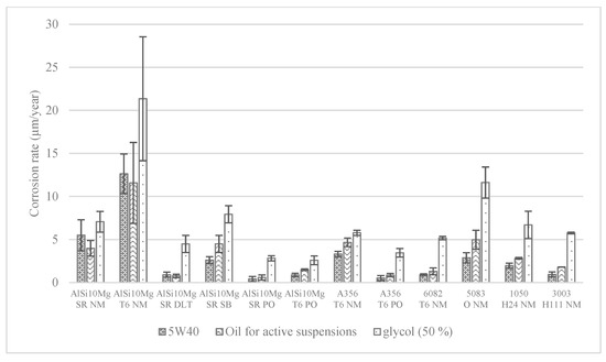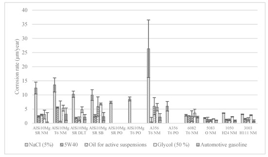 The result is graphically evident in Figure 17, which compares the results with those previously presented for full immersion in saline water (NaCl 5%). It is clear that NaCl (5%) is a more corrosive environment than the other fluids, especially for additively manufactured AlSi10Mg and cast A356 components. In some of the test cases, high deviation of results was obtained due to the large amounts of corrosion products deposited on the samples.