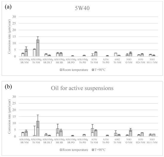 The AlSi10Mg_T6_NM showed a surprisingly high corrosion rate value in all three fluids tested at high temperatures, although no corrosion products were present on the surface. The reason for this phenomenon is not clear. It is possible that a sufficiently long stay at a high temperature promotes general and uniform corrosion over the entire surface of AlSi10Mg_T6_NM specimens. Again, corrosion may be favoured by the AlSi10Mg T6 microstructure described in the previous sections. The graphs in Figure 19a–c compare the results of the tests at room temperature and at 90 °C for 5W40 oil, oil for active suspensions and glycol (50%).