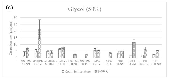 This phenomenon was partially confirmed by the corrosion rate calculation. As shown in Figure 18, glycol (50%) at 90 °C led to a generally higher corrosion rate in comparison to the other fluids. However, almost all values, with the exception of the AlSi10Mg_T6_NM specimens, were around or below 5µm per year and are, therefore, to be considered negligible.