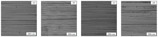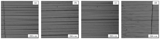 The friction coefficient is the ratio of the friction force between the sample and contact surface of the grinding part, to the positive pressure perpendicular to the sample surface, and can be directly obtained from the friction and wear experiment [26,27]. In the mutual friction process, the friction coefficient is a comprehensive characteristic of the friction pair, which is affected by multiple factors, such as the rigidity, elastic geometric characteristics, sliding speed, humidity, temperature, and normal load of the friction pair [28,29]. Under identical experimental conditions, the friction coefficient is not related to the contact area but to the roughness of the contact surface. The wear morphology is an important basis to determine the wear mode. The wear morphology is magnified by scanning electron microscopy that can provide feedback on the wear condition and wear mode of the sample surface material and is one of the commonly used methods to characterize the wear resistance of the sample material [30,31,32]. Wear quantity, including volume wear quantity and mass wear quantity, is an important parameter to quantitatively characterize the wear resistance of specimens. Due to the small mass loss, it is difficult to accurately measure. In this paper, the volumetric wear rate is used to represent wear resistance. Formula (1) calculates the volumetric wear, and Formula (2) calculates the volumetric wear rate.