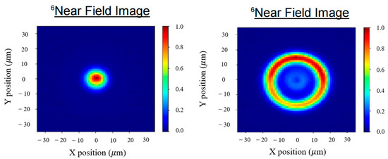 Programed intensity profiles of a spot laser beam (left) and a doughnut laser beam (right).