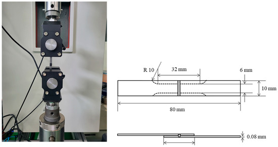 To examine the features of the welds obtained using different beam shapes, the weld bead geometry, weldability, microstructure, and mechanical properties were characterized. The surface and cross-section of the welds were observed under an optical microscope (OM) (Keyence, Osaka, Japan). The specimen was prepared by polishing and etching, then the cross-sectional welded image was observed at 1.5 mm from the welding start area. A laser microscope was used to measure the surface roughness. The microstructures were investigated by using electron backscatter diffraction (EBSD) (EDAX/TSL, Pleasanton, CA, USA) imaging, and the data were post-processed using the OIM software (ver.8.0, EDAX, Pleasanton, CA, USA). The EBSD specimens were prepared by mirror polishing and subsequent vibration polishing. To evaluate the mechanical properties of the thin-plate welds, the tensile strength was measured three times per condition. The tensile shear test specimen shape of the 316 L stainless steel welded joint was referenced with the ASTM E-8 standard [15]. After welding, the materials were cut into small specimens for the tensile shear tests. The schematic of the thin-foil-welded joint is shown in detail in Figure 3. In this study, the welded joints interface was considered for calculating the tensile shear strength.