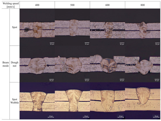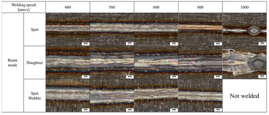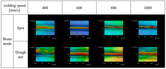 Figure 4 shows the laser microscope images of the welded surfaces obtained by spot or doughnut laser beam. In both conditions, some defects, such as humping beads, were observed as the welding speed increased, and the molten pool was unstable at low welding speeds. In terms of surface morphology, welding at a speed of 400 mm/s had poor penetration. Increasing the speed to 600 mm/s created some humping beads. Figure 5 shows the enlarged surface of the welded part when the welding speed was 500 mm/s. No significant defects were observed in Figure 5, suggesting 500 mm/s was the best welding speed. The surface roughness was 3.19 for the spot beam and 4.59 for the doughnut beam. Figure 6 shows the surface of the laser-welded area at various welding speeds observed by an optical microscope. For three types of laser beam, the best surface condition was achieved when the welding speed was 500 mm/s. In spot and doughnut beam welding, defects, such as humping beads, were observed as the welding speed increased, whereas the spot-wobble beam welds had relatively minor surface defects. For the doughnut beam, poor penetration was observed at a welding speed of 1000 mm/s, as excessive heat input decreased energy density and the energy density was concentrated on the welding edge rather than on the central area. For spot-wobble welding at a speed of 1000 mm/s, the two foils could not be joined because of low energy density.