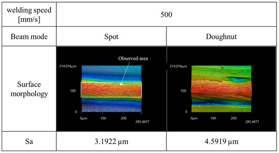Enlarged microscopic topography image of the laser-welded surface at 500 mm/s welding speed using spot and doughnut beams.