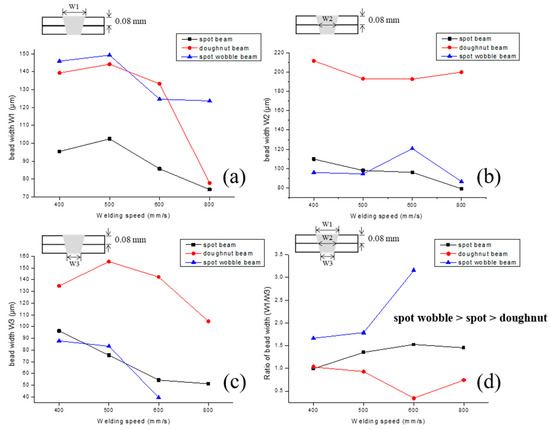 The cross-section of the welded area was observed to study the dependence of penetration depth and width on the shape of the laser beam. When the welding speed was 1000 mm/s, the penetration was poor; therefore, Figure 7 only shows the cross-sections obtained at lower welding speeds. The spot and spot-wobble beams exhibited superior welding qualities up to a welding speed of 600 mm/s, whereas the doughnut beam had poor welding quality at 600 mm/s. For all three conditions, the best cross-sectional state was found at a speed of 500 mm/s. As the welding speed increased, humping beads were prominently observed in spot-beam welds at 800 mm/s. In the case of the doughnut beam, a severe undercut was formed owing to excessive local heat input at the welding edge, implying that the molten metal could not spread before solidification at the high welding speed. For the spot beam, despite the energy density being approximately 2.5 times higher than that of the doughnut beam, the penetration was not deep at a speed of 800 mm/s. Thus, compared to the spot and spot-wobble beams, the doughnut beam could transmit energy to the bottom of the thin plate more effectively. Figure 8 shows the bead width in the cross-sectional image, and w1, w2, and w3 indicate the top, middle, and bottom widths of the bead. The doughnut beam generated the widest bead, and its top width decreased rapidly at 800 mm/s. For the spot-wobble beam, the top width was similar to that of the doughnut beam; however, as the speed increased, the penetration did not reach the bottom. In addition, the bottom width was narrower than the top width. The spot beam welding had the smallest bead widths. When the ratio of the top width to the bottom width was compared, the spot beam had a ratio close to 1, suggesting the penetration of the overall weld cross-section was straight. The spot-wobble beam had the sharpest penetration shape and the doughnut beam had a circular weld cross-section.