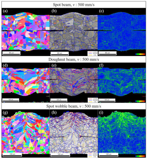 EBSD maps of the cross-sectional weld bead (a) inverse pole figure (IPF), (b) image quality (IQ) map with grain boundaries (GBs) characterization, (c) kernel average misorientation map (KAM) in spot-beam laser welding, (d) IPF, (e) IQ map with GB characterization, (f) KAM map in doughnut beam laser welding, (g) IPF, (h) IQ map with GB characterization, and (i) KAM map in spot-wobble beam laser welding.
