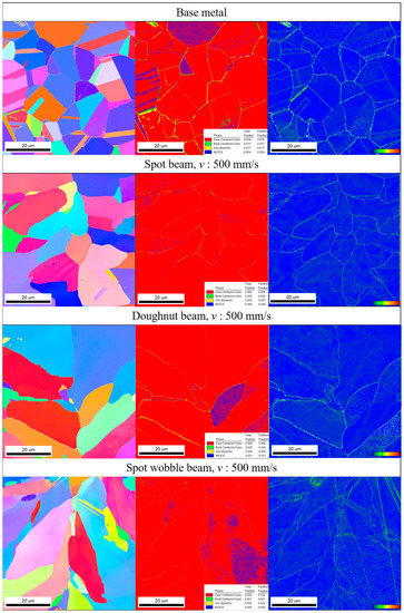 Considering the surface morphology, cross-sectional welding area, and tensile strength, the optimal welding speed was 500 mm/s. Therefore, in this section, the welding speed was fixed at 500 mm/s for comparing the welded microstructure in different laser beam shapes by carrying out EBSD. Figure 11 shows the inverse pole figure (IPF), image quality (IQ) map with grain boundaries (GBs) characterization, and kernel average misorientation map of the welding parts measured by EBSD.