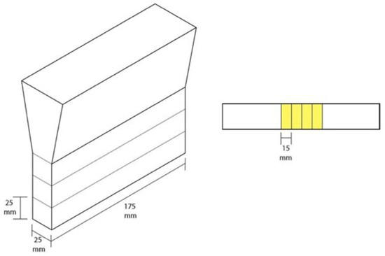 The HSDI was produced in a medium-frequency induction furnace. Steel scrap was used as raw material, e.g., crankshafts and foundry waste. Graphite and copper C11000 were used to adjust the composition of the DI. Nodularization and inoculation processes were carried out with FeSi (75 wt.% Si) and FeSiMg (7 wt.% Mg) alloys by sandwich and ladle methods, respectively. In order to obtain different Nb contents in the HSDI, an FeNb alloy (65 wt.% Nb) in powder form was added to the ladle to achieve better dissolution during casting. After maintaining a temperature of 1400 ± 20 °C, the molten iron was poured into Y-shaped molds (175 × 150 × 25 mm3) according to ASTM A-536-84 [42]. Molds were allowed to cool for 24 h before the samples were cut out of the useful area of the Y-block to obtain smaller samples of 25 × 25 × 15 mm3, as shown in Figure 1.