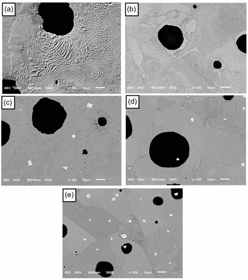 Figure 2 shows the different microstructures identified by SEM for all samples. Graphite nodules embedded in a full pearlitic matrix can be seen for commercial DI in Figure 2a, whereas a pearlitic-ferritic matrix for U-HSDI is observed in Figure 2b. For all HSDI samples with different Nb content, a change in the phase fraction in the metallic matrix was observed, as well as the presence of small irregular particles randomly distributed and corresponding to polygonal primary NbC carbides. These particles form before the casting due to the high affinity between Nb and C atoms, so they are called primary carbides [18,21,22,24,25,26,27,28,29,30,31]. Unlike other carbide-forming elements (Mo, Cr, and V), precipitation of NbC carbides occurs randomly throughout the material rather than by positive segregation. Regarding the changes in the matrix, it is observed that for the HSDI-0.3% Nb sample, there is a refinement in the pearlite in comparison with the U-HSDI and the commercial DI samples, as reported by [27,28,29]; however, for the HSDI-0.6% Nb and HSDI-0.9% Nb samples, this refinement is not observed. On the contrary, a mostly ferritic matrix was obtained, which is attributable to the high silicon content in the alloy.