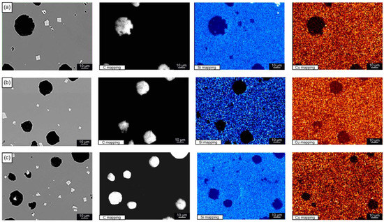 Distributions of C, Si, and Cu in samples: (a) HSDI-0.3% Nb, (b) HSDI-0.6% Nb, (c) HSDI-0.9% Nb, obtained by EDX at 1000×.
