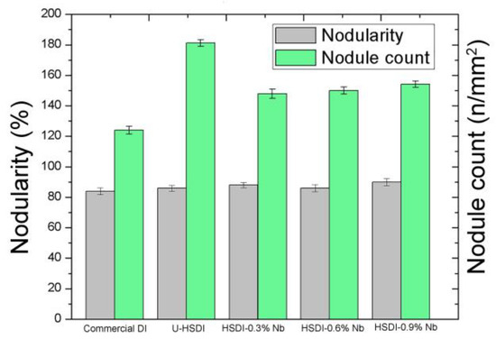 - Nodularity maintained a linear trend between 86 and 90%, and the nodule count decreased with the presence of Nb in the HSDI, from 182 n/mm2 for U-HSDI to 147–154 n/mm2 for HSDI-% Nb samples.
