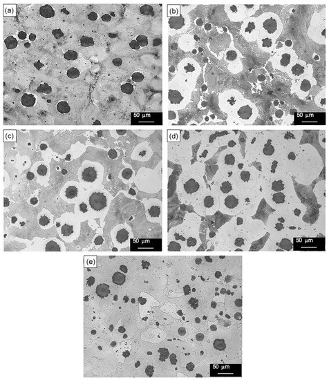 With the purpose of modifying the structure and properties of HSDI, the addition of different carbide-forming elements, such as V, Cr, Mo, and Mn has been investigated by several authors [18,19,20]. Riebisch et al. [18] have studied the effect of carbide-forming elements on HSDI with 3.8 wt.% Si. They have found that V has a significant negative influence on graphite morphology, as it promotes the formation of chunky graphite due to a long solidification time and its effect of slowing down the diffusion of C into austenite; on the other hand, Cr and Mn have the greatest influence on pearlite area fraction, due to their segregation. Similarly, Górny et al. [19] studied the influence of 0.65 wt.% Mo on HSDI with 4.36 wt.% Si and reported a microstructure of graphite nodules in a ferrite matrix with a small amount of pearlite, as well as the formation of Fe–Mo carbides, which were related to segregation during solidification rather than to cooling rates to the eutectoid temperature. Although some authors have studied HSDI with carbide-forming elements, the role of Si in such castings must be better understood due to the wide range of HSDI applications.