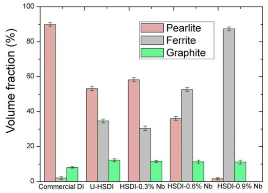 The eutectoid transformation was limited by the reduction of free carbon in the liquid, and as a result of the precipitation of graphite and the NbC primary carbides, the ferrite content in the microstructure varies from 34% for U-HSDI to 88% for HSDI-0.9% Nb. Nevertheless, when only the metallic matrix is considered, the ferrite content increased from 39 to 98% with the addition of Nb, as shown in Figure 9. According to some studies [21,24,26,50], the addition of Nb as a microalloying element (0.09–0.11 wt.%) increases hardenability and the equilibrium carbon content in austenite, and causes further pearlitic transformation to a cast structure of DI. In the present study, the resulting microstructures of different HSDI-Nbs show that the pearlite is refined only to HSDI-0.3% Nb sample in comparison to U-HSDI; nevertheless, an increase of more than 0.3 wt.% Nb ended up decreasing the pearlite volume fraction.