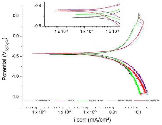 Potentiodynamic curves of commercial DI and HSDI with different Nb contents.