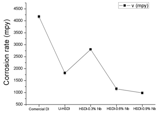 It is obvious that the addition of Nb at concentrations higher than 0.3 wt.% to HSDI decreases the corrosion rate when comparing the U-HSDI sample with the HSDI-% Nb samples. The amount of fine NbC carbides precipitated in the metal matrix increased the corrosion resistance; as a result, the corrosion rate was reduced by 59% (1156 mpy) and 65% (986 mpy) for the HSDI-0.6 wt.% Nb and HSDI-0.9 wt.% Nb samples, respectively, compared to the DI-0.3 wt.% Nb sample (2802 mpy).