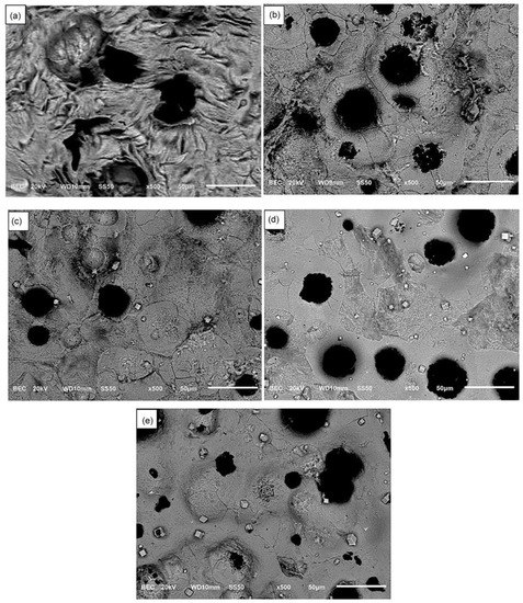 SEM microstructures of all corroded surfaces of HSDI with different Nb contents: (a) commercial DI, (b) U-HSDI, (c) HSDI-0.3% Nb, (d) HSDI-0.6% Nb, (e) HSDI-0.9% Nb.