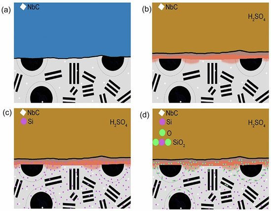Figure 14 shows the scheme of the corrosion mechanism of Nb-HSDI exposed to H2SO4, as a result of potentiodynamic curves and microstructures analysis. In Figure 14a the HSDI is presented with a mixture of ferritic–pearlitic matrix, with embedded graphite nodules and NbC dispersed within the microstructure. At this stage, it was not yet in contact with the electrolyte; that is, it did not start the corrosion process. At the beginning of the corrosion process, as can be seen in Figure 14b, upon contact with the electrolyte, galvanic pairs were formed between the graphite and matrix (Figure 14c), resulting in a corroded surface; however, the graphite nodules were unaffected, as shown in Figure 14d.